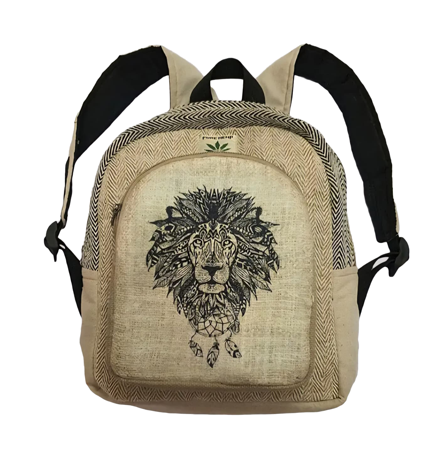 This handcrafted backpack is ethically sourced from Nepal and made by skilled local women using natural hemp or hemp-cotton blend fabrics. Designed with sustainability in mind, it features a bold lion-inspired tribal print that represents strength and individuality. Durable yet lightweight, the backpack includes padded shoulder straps, a spacious main compartment, and secure zipper closures for everyday comfort. Perfect for school, travel, work, or casual use, each bag reflects traditional craftsmanship, eco-conscious materials, and fair-trade values.